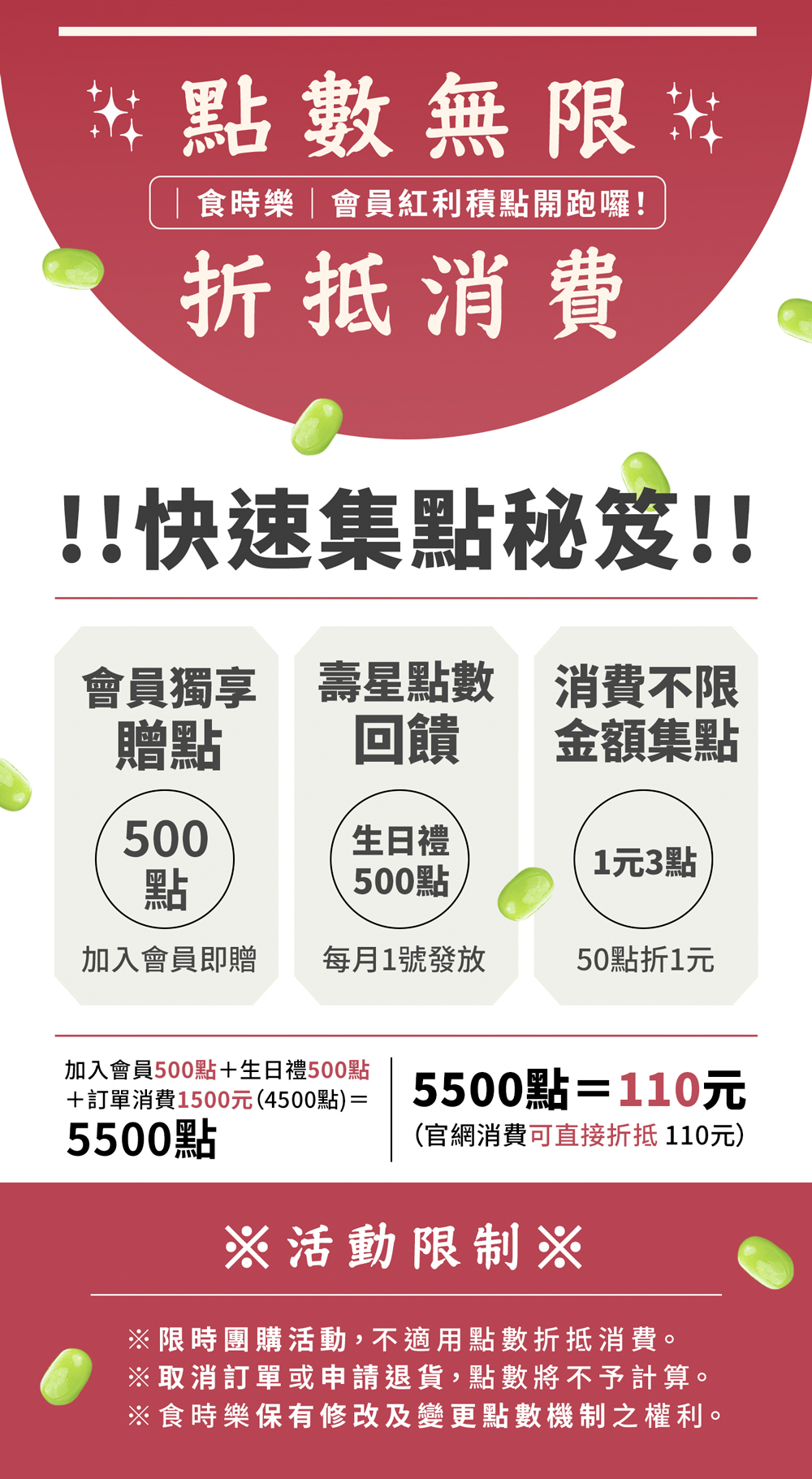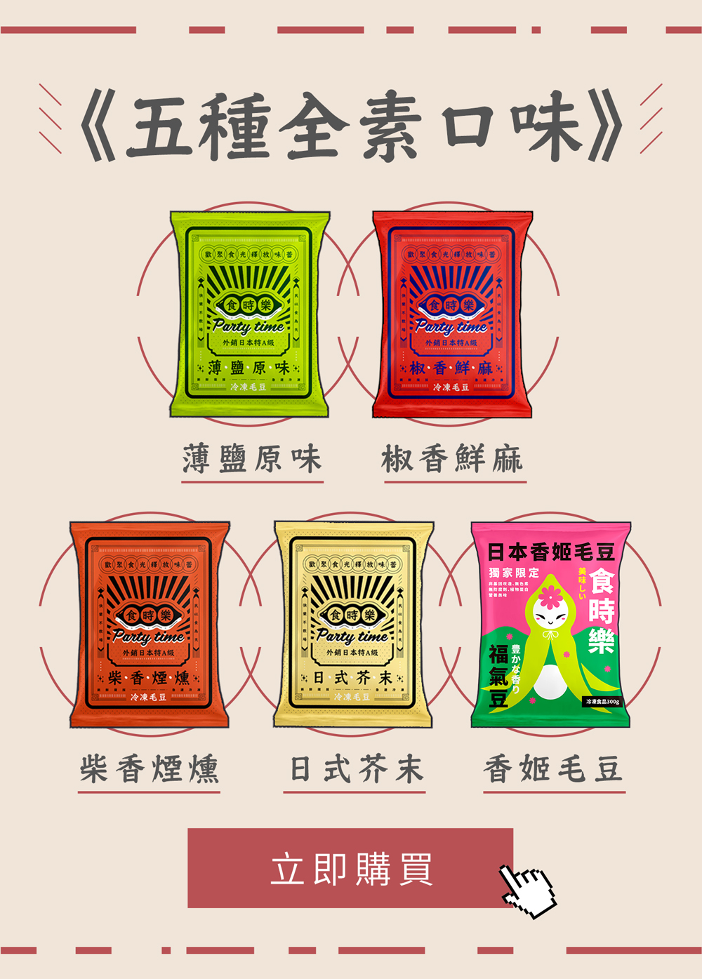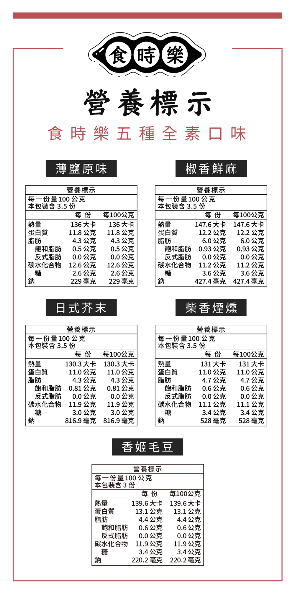 A3:食時樂毛豆共有五種口味,素食者皆可食用,因可食用成分每人不同,如需成分表請洽客服。